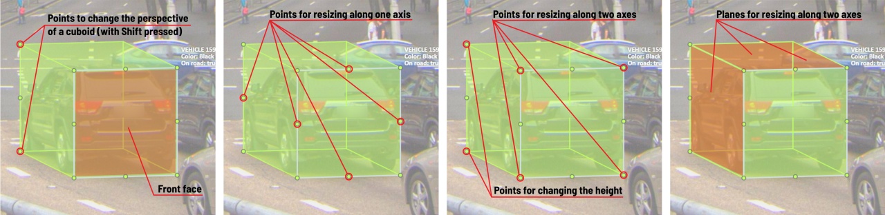The cuboid can be edited in multiple ways: by dragging points, by dragging certain faces or by dragging planes. First notice that there is a face that is painted with gray lines only, let us call it the front face.