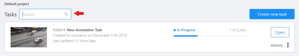 owner: admin- all tasks created by the user who has the substring “admin” in his nameassignee: employee- all tasks which are assigned to a user who has the substring “employee” in his namename: training- all tasks with the substring “training” in their namesmode: annotationormode: interpolation- all tasks with images or videos.status: annotationorstatus: validationorstatus: completed- search by statusid: 5- task with id = 5.