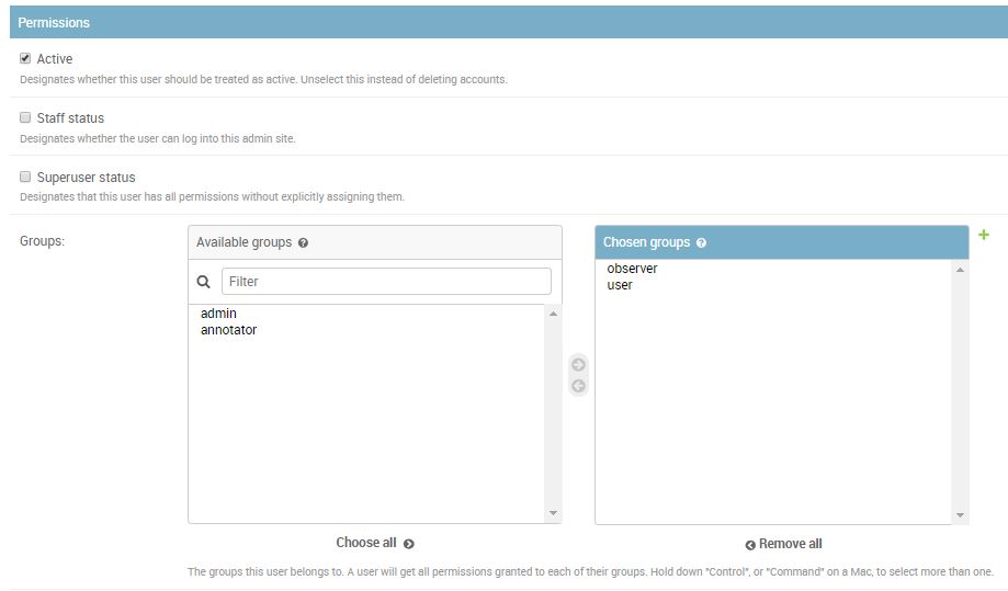 If you want to create a non-admin account, you can do that using the link below on the login page. Don’t forget to modify permissions for the new user in the administration panel. There are several groups (aka roles): admin, user, annotator, observer.