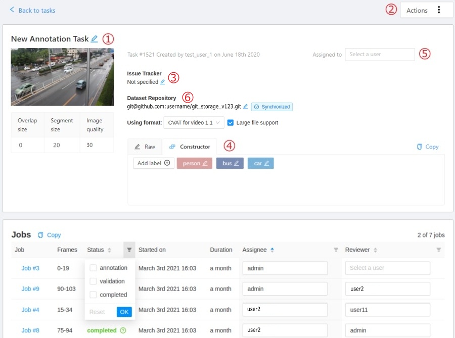 annotation,validationoracceptance. This value affects the task progress bar. - A state of the job. The state can be changed by an assigned user in the menu inside the job.