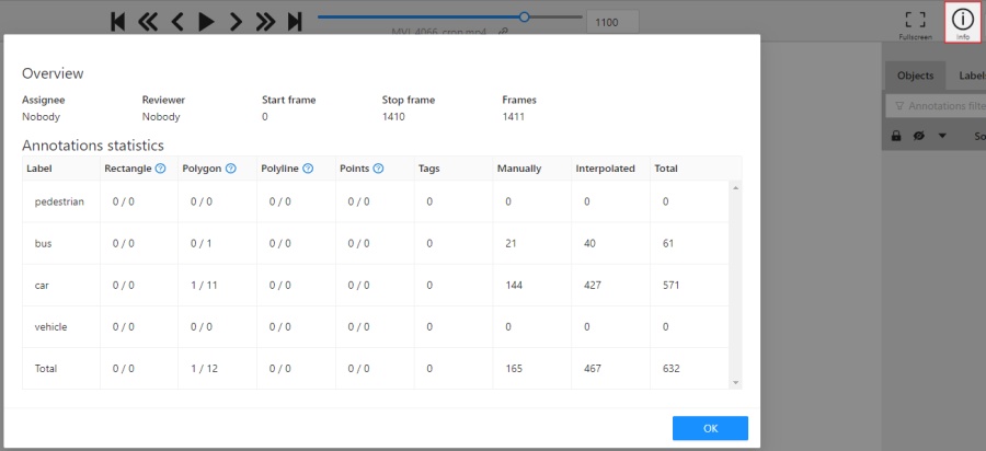 This is a table number of created shapes, sorted by labels (e.g. vehicle, person) and type of annotation (shape, track). As well as the number of manual and interpolated frames.