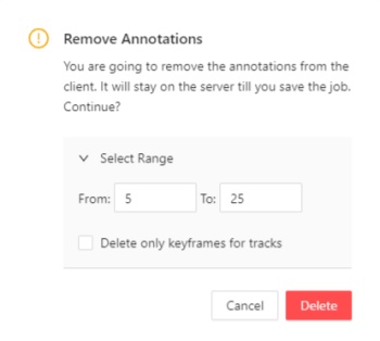 Remove Annotations— calls the confirmation window if you clickDelete, the annotation of the current job will be removed, if you clickSelect rangeyou can remove annotation on range frames, if you activate checkboxDelete only keyframe for tracksthen only keyframes will be deleted from the tracks, on the selected range.