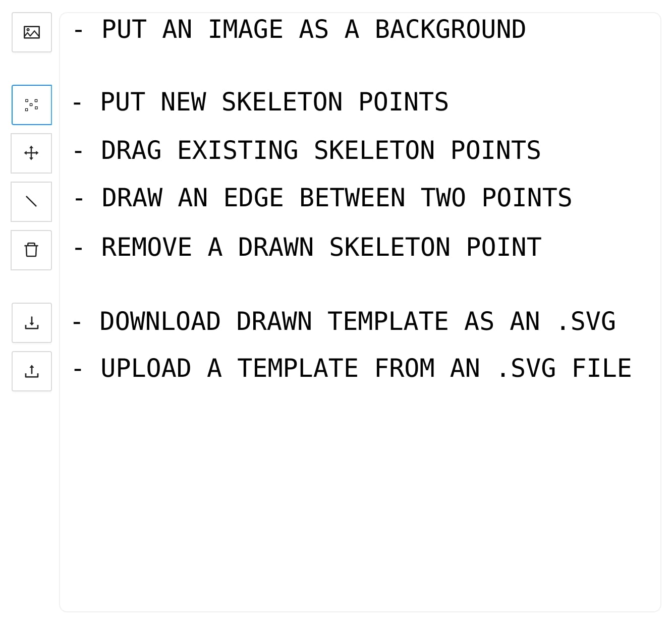 - PUT NEW SKELETON POINTS - is activated by default. It is a mode where you can add new skeleton points clicking the drawing area.