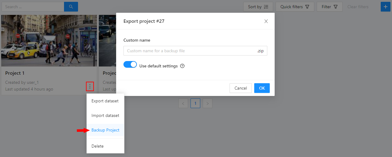 To backup a task or project, open the action menu and select Backup Task or Backup Project.
