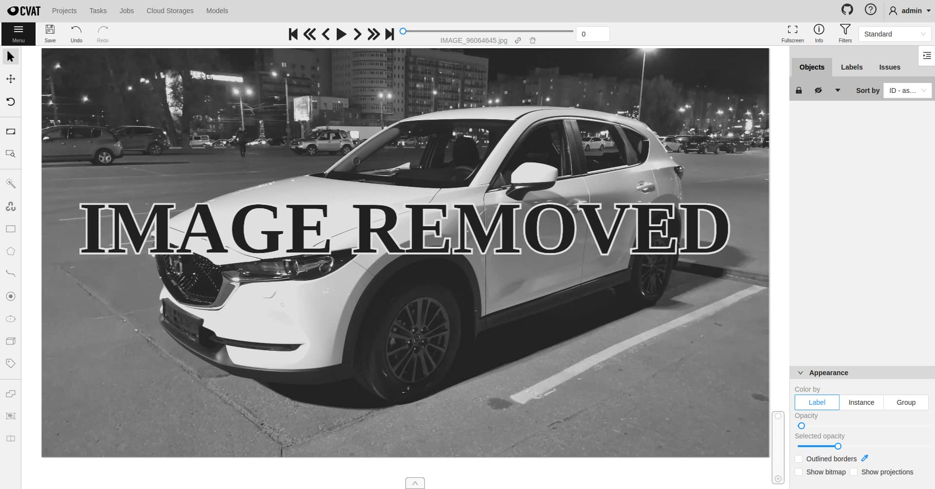 You can delete the current frame from a task. This frame will not be presented either in the UI or in the exported annotation. Thus, it is possible to mark corrupted frames that are not subject to annotation.