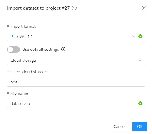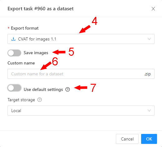 LocalorCloud storage. The default settings are the settings that had been selected when the project was created (for example, if you specified a local storage when you created the project, then by default, you will be prompted to export the dataset to your PC). You can find out the default value by hovering the mouse over the?. Learn more about attach cloud storage.