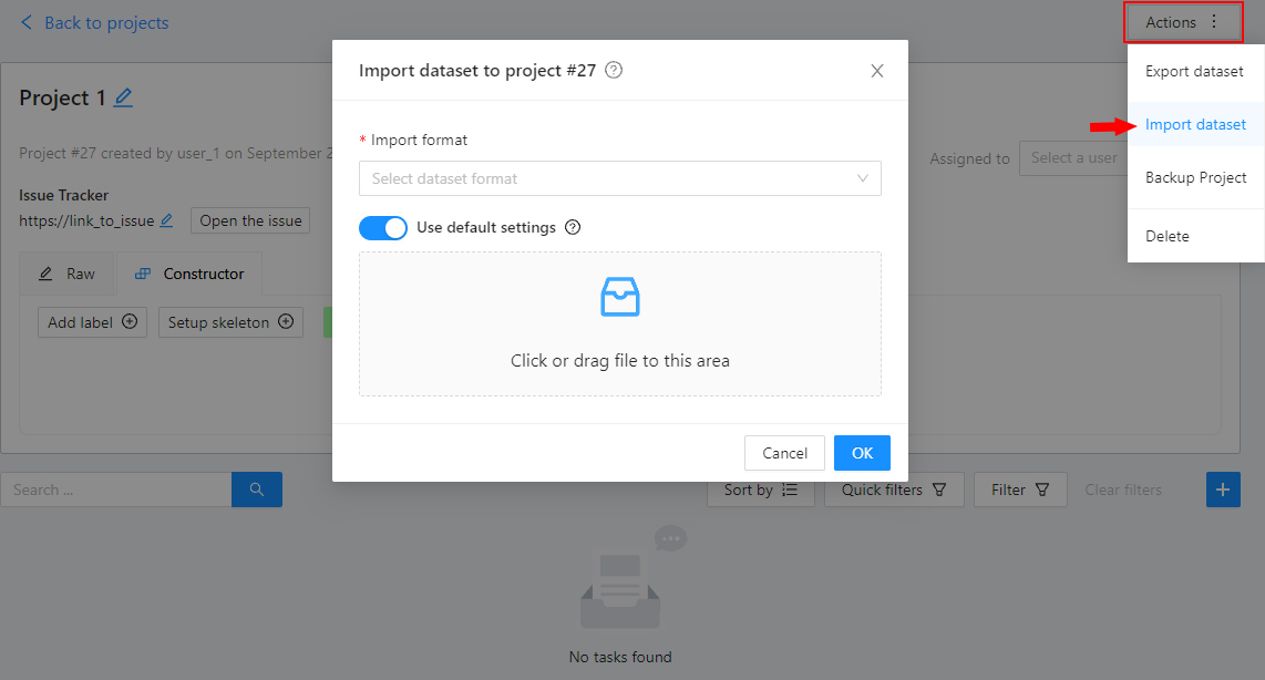 Import datasetbutton. - Select the dataset format (if you did not specify a custom name during export, the format will be in the archive name).