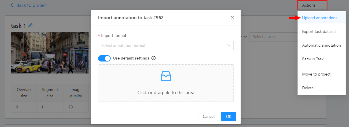 In the task or job you can upload an annotation. For this select the item Upload annotation