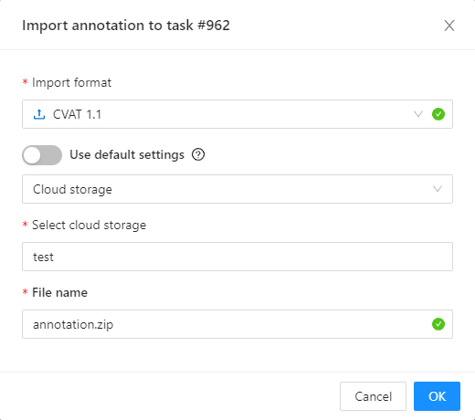 Here you should select the annotation format, then select a cloud storage from the list or use default settings