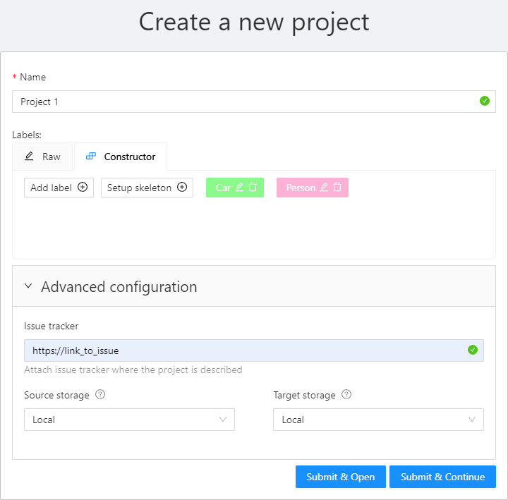 You can change: the name of the project, the list of labels (which will be used for tasks created as parts of this project) and a skeleton if it’s necessary. In advanced configuration also you can specify: a link to the issue, source and target storages. Learn more about creating a label list, creating the skeleton and attach cloud storage.