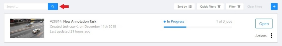 owner: admin- all tasks created by the user who has the substring “admin” in his nameassignee: employee- all tasks which are assigned to a user who has the substring “employee” in his namename: training- all tasks with the substring “training” in their namesmode: annotationormode: interpolation- all tasks with images or videos.status: annotationorstatus: validationorstatus: completed- search by statusid: 5- task with id = 5.